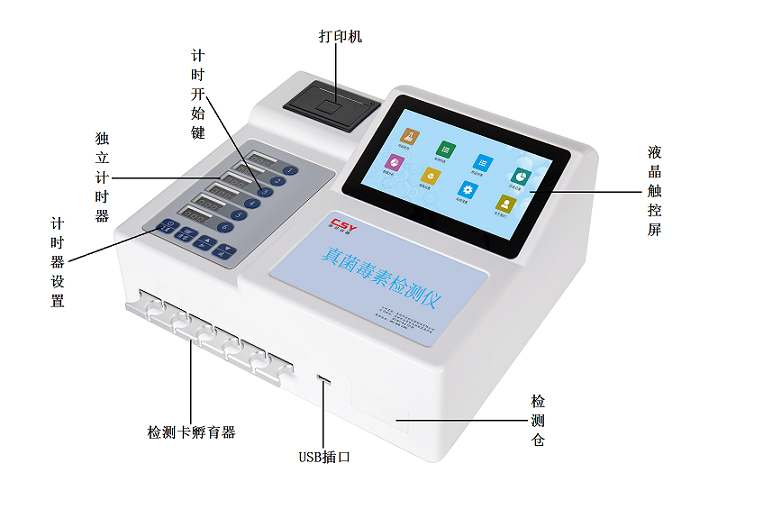 深圳市芬析儀器制造有限公司(深芬儀器)CSY-YG701黃曲霉毒素測定儀通過檢測線熒光定量卡中的熒光強弱程度,定量分析待檢樣品中黃曲霉毒素B1殘留含量;能夠快速定量檢測玉米、小麥、大米、大麥、小米和燕麥等谷物、飼料、面粉、食用油、調味品中黃曲霉毒素B1,黃曲霉毒素測定儀適用于糧庫收糧檢測、糧油監測中心、糧油飼料生產加工、食品加工貿易、畜禽養殖戶自查、質監部門用于市場快速篩查等。